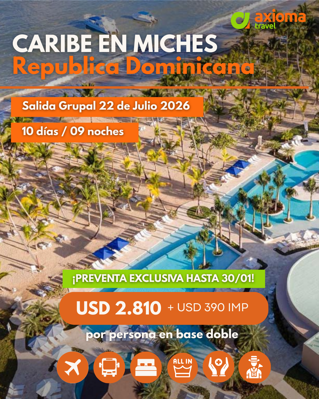OBSERVACIONES: Tarifas de preventa por persona base habitación doble vigentes hasta el 30/11/2025 o agotar las plazas disponibles (25) lo que ocurra primero. Expresadas y pagaderas en USD dólares americanos válidas para viajar en la fecha indicada y sujetas a modificación. El ítem impuestos incluye impuestos, tasas aeroportuarias, IVA y gastos administrativos. Viajamos protegidos con seguro médico internacional hasta 75 años de edad ASSISTO 150 con tope de cobertura de USD 150.000.- y preexistencias hasta USD 20.000.- que opera por sistema de reintegro. Tickets aéreos en clase económica de LATAM con equipaje en bodega de 23 Kg máximo 158 cm lineales. Los vuelos, horarios, aeropuertos de salida y/o arribo están sujetos a modificación y/o reprogramación por parte de la compañía aérea sin que sea imputable responsabilidad al operador. Las fotografías contenidas en nuestra web son meramente ilustrativas y no revisten carácter contractual. El hecho de efectuar el pago del derecho de inscripción o seña implica por parte tanto del/de los pasajeros como de la agencia interviniente pleno cono-cimiento y total conformidad con estas Condiciones Generales y Especiales. Condiciones Generales disponibles en nuestra página web www.axiomatravel.com.ar exceptuando condiciones especiales detalladas para esta salida en el itinerario correspondiente. Operador responsable AXIOMA Travel LEG 14167 EXP 1280/09 – CUIT 20-21459332-8.