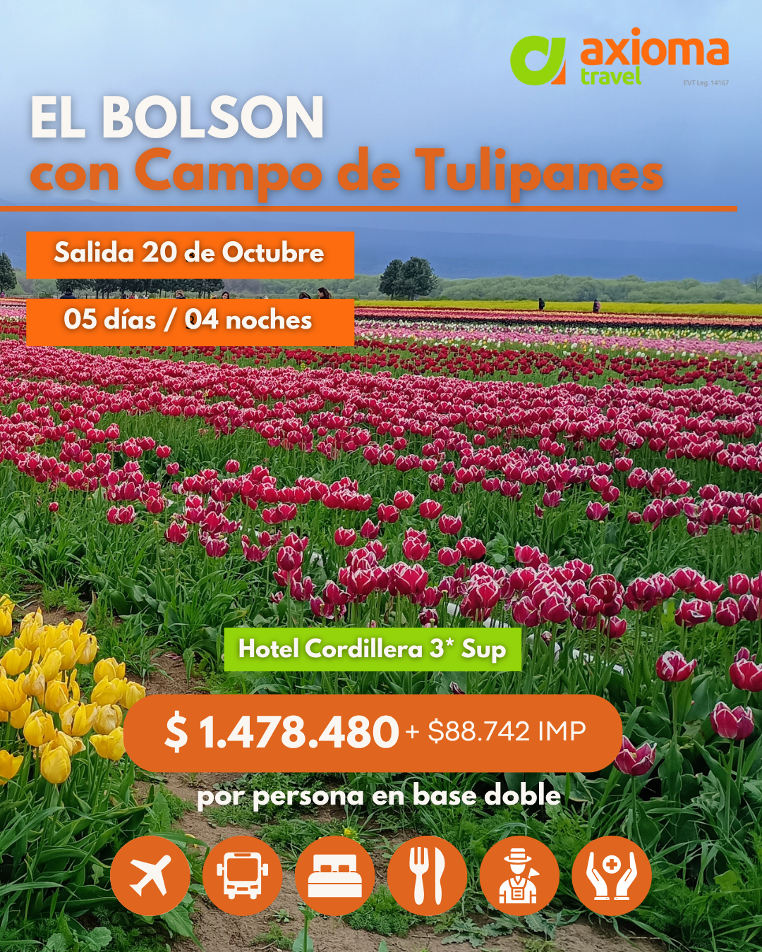 Tarifas por persona expresadas en pesos en base habitación doble válidas para viajar en la fecha indicada. El ítem impuestos incluye impuestos y tasas aeroportuarias, gastos de reserva y gastos administrativos. Viajamos protegidos con cobertura RESIDENT PROTECT 400 de AVRIL ASSISTANCE (las condiciones generales a las que se limita AVRIL Asístanse están a disposición y pueden ser consultadas en cualquier momento sin obligación de compra en www.avril-assistance.com). Tickets aéreos no permiten cambio de fecha ni devolución. Los vuelos, horarios, aeropuertos de salida y/o arribo están sujetos a modificación y/o reprogramación por parte de la compañía aérea sin que sea imputable responsabilidad al operador. No incluye entradas a Campo de Tulipanes, Área Natural Protegida Cascadas Nant & Fall ni PN Lago Puelo. POLITICAS de CANCELACIÓN:1:Aéreos de cupo no son reembolsables en caso de cancelación de la reserva y no permiten cambio de fecha. 2: En caso de cancelación de la reserva entre los 60 y 46 días previos a la fecha de salida se retendrá el importe correspondiente a los aéreos y se reintegrará el resto del importe abonado descontando gastos bancarios y administrativos 3: En caso de cancelación de la reserva entre 45 y 31 días antes de la fecha de salida se cobrara una penalidad del 50% del precio total del tour. 4: En caso de cancelación de la reserva dentro de los 30 días previos a la fecha de salida no habrá reintegro alguno y se cobrara una penalidad del 100% del total del precio del tour. En todos los casos se tomara como fecha de cancelación válida el día hábil en que el operador realice el acuse de recibo de la misma por escrito. Las fotografías contenidas en nuestra web son meramente ilustrativas y no revisten carácter contractual. Condiciones generales según indicado en nuestra página web https://axiomatravel.com.ar/condiciones-generales/ exceptuando condiciones especiales detalladas para esta salida. Operador responsable AXIOMA Travel EVT Legajo 14167 – CUIT 20-21459332-8.