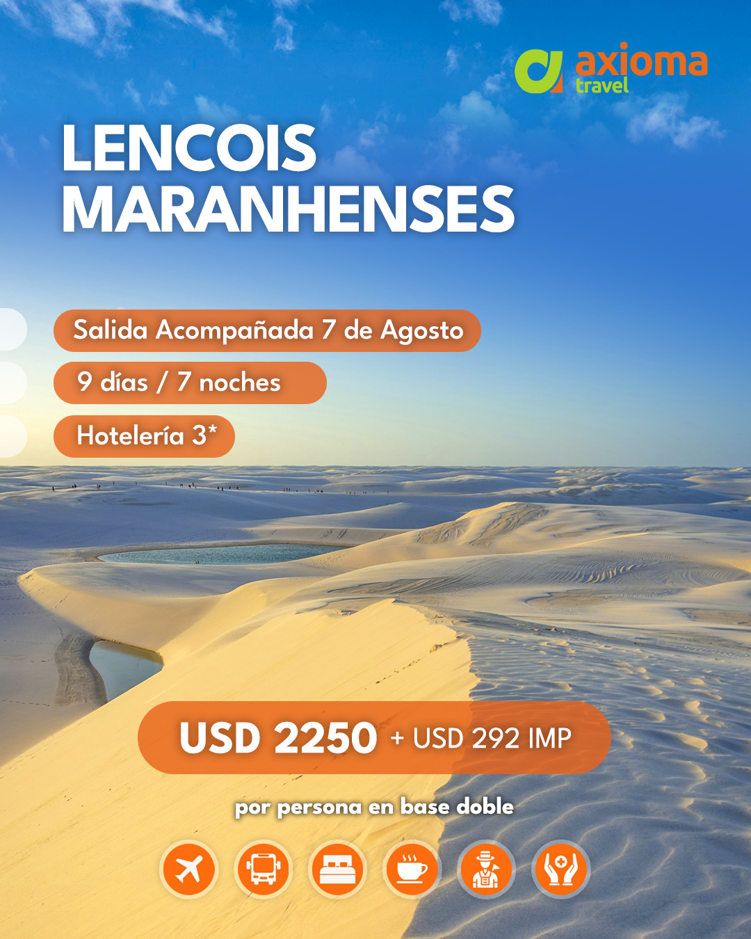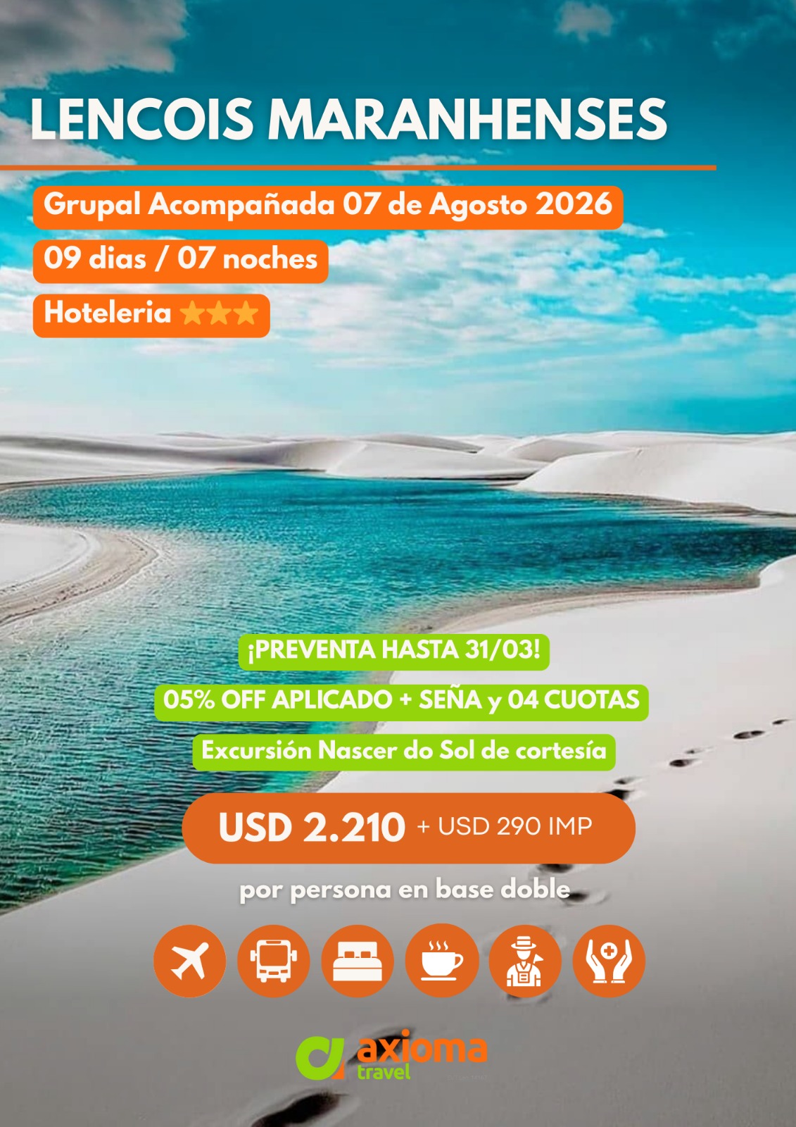 OBSERVACIONES: Tarifas de preventa vigentes hasta el 31/03/2026 o agotar las plazas disponibles (19) lo que ocurra primero. Expresadas y pagaderas en USD dólares americanos válidas para viajar en la fecha indicada y sujetas a modificación. El ítem impuestos incluye impuestos, tasas aeroportuarias, IVA y gastos administrativos. Viajamos protegidos con seguro médico internacional hasta 74 años de edad ASSISTO 150 con tope de cobertura de USD 150.000.- y preexistencias hasta USD 20.000.- que opera por sistema de reintegro. Tickets aéreos en clase económica de GOL con equipaje en bodega de 23 Kg máximo 158 cm lineales. Los vuelos, horarios, aeropuertos de salida y/o arribo están sujetos a modificación y/o reprogramación por parte de la compañía aérea sin que sea imputable responsabilidad al operador. Las fotografías contenidas en nuestra web son meramente ilustrativas y no revisten carácter contractual. El hecho de efectuar el pago del derecho de inscripción o seña implica por parte tanto del/de los pasajeros como de la agencia interviniente pleno conocimiento y total conformidad con estas Condiciones Generales y Especiales. Condiciones Generales disponibles en nuestra página web www.axiomatravel.com.ar exceptuando condiciones especiales detalladas para esta salida en el itinerario correspondiente. Operador responsable AXIOMA Travel LEG 14167 EXP 1280/09 – CUIT 20-21459332-8.