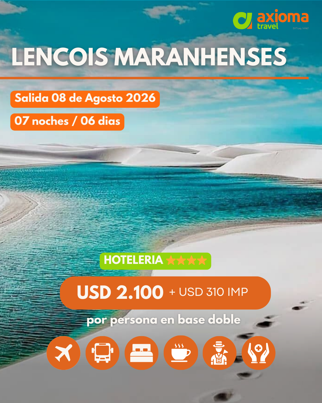 OBSERVACIONES: Tarifas de preventa vigentes hasta el 30/01/2026 o agotar las plazas disponibles (19) lo que ocurra primero. Expresadas y pagaderas en USD dólares americanos válidas para viajar en la fecha indicada y sujetas a modificación. El ítem impuestos incluye impuestos, tasas aeroportuarias, IVA y gastos administrativos. Viajamos protegidos con seguro médico internacional hasta 74 años de edad ASSISTO 150 con tope de cobertura de USD 150.000.- y preexistencias hasta USD 20.000.- que opera por sistema de reintegro. Tickets aéreos en clase económica de GOL con equipaje en bodega de 23 Kg máximo 158 cm lineales. Los vuelos, horarios, aeropuertos de salida y/o arribo están sujetos a modificación y/o reprogramación por parte de la compañía aérea sin que sea imputable responsabilidad al operador. Las fotografías contenidas en nuestra web son meramente ilustrativas y no revisten carácter contractual. El hecho de efectuar el pago del derecho de inscripción o seña implica por parte tanto del/de los pasajeros como de la agencia interviniente pleno conocimiento y total conformidad con estas Condiciones Generales y Especiales. Condiciones Generales disponibles en nuestra página web www.axiomatravel.com.ar exceptuando condiciones especiales detalladas para esta salida en el itinerario correspondiente. Operador responsable AXIOMA Travel LEG 14167 EXP 1280/09 – CUIT 20-21459332-8.