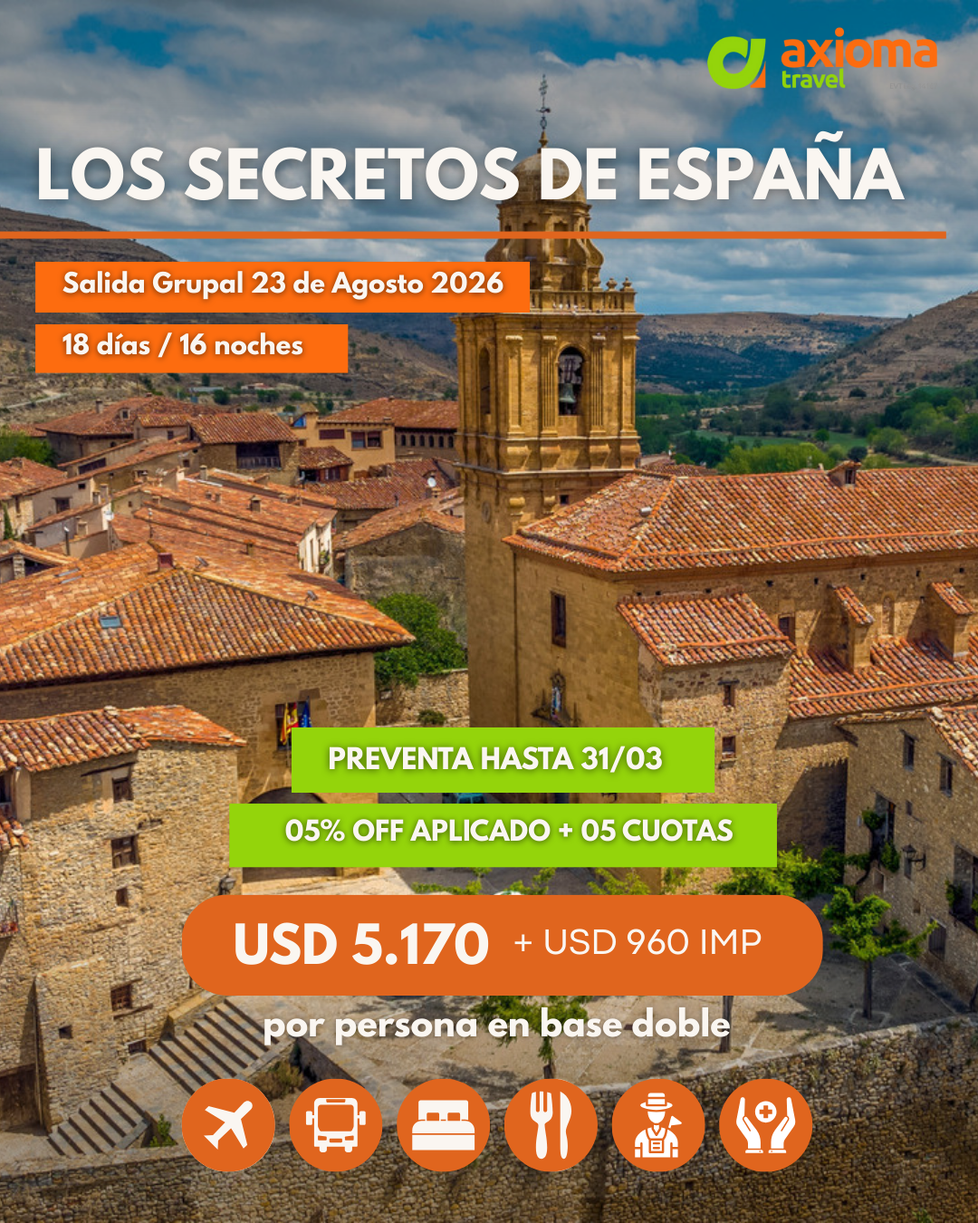 OBSERVACIONES:  Tarifas expresadas y pagaderas en USD dólares americanos válidas para reservas ingresadas hasta el 31/03/2026 para viajar en la fecha indicada y sujetas a modificación. El ítem impuestos incluye impuestos, tasas aeroportuarias, IVA y gastos administrativos. Viajamos protegidos con seguro médico internacional hasta 84 años de edad ASSISTO 150 con tope de cobertura de USD 150.000.- y preexistencias hasta USD 20.000.- que opera por sistema de reintegro. Pasajes aéreos en clase económica de Iberia con equipaje en bodega de 23 Kg máximo 158 cm lineales. Los vuelos, horarios, aeropuertos de salida y/o arribo están sujetos a modificación y/o reprogramación por parte de la compañía aérea sin que sea imputable responsabilidad al operador. Las fotografías contenidas en nuestra web son meramente ilustrativas y no revisten carácter contractual. El hecho de efectuar el pago del derecho de inscripción o seña implica tanto por parte de los pasajeros como de la Agencia interviniente el pleno conocimiento y total conformidad con dichas Condiciones Generales y Especiales aplicables a esta salida. Condiciones Generales disponibles en https://axiomatravel.com.ar/condiciones-generales/ exceptuando las condiciones especiales detalladas para esta salida en el itinerario corres-pondiente. Operador responsable AXIOMA Travel LEG 14167 EXP 1280/09 – CUIT 20-21459332-8.