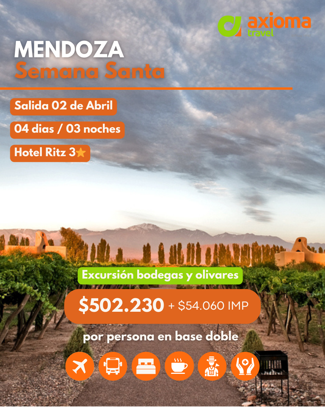 OBSERVACIONES: Tarifas por persona en base habitación doble expresadas en ARS. Son comisionables según convenio para AGT, válidas para viajar en la fecha indicada y sujetas a modificación. El ítem impuestos incluye impuestos y tasas aeroportuarias, gastos de reserva y gastos administrativos. Viajamos protegidos con ASSISTO 10 de ASSISTO TRAVEL PROTECTION con tope de cobertura de USD 10.000 y seguro de cancelación para pasajeros de hasta 74 años. Condiciones generales disponibles aquí.Tickets aéreos no permiten cambio de fecha ni devolución. Los vuelos, horarios, aeropuertos de salida y/o arribo están sujetos a modificación y/o reprogramación por parte de la compañía aérea sin que sea imputable responsabilidad al operador. Políticas de cancelación disponibles en el tarifario correspondiente en la solapa HERRAMIENTAS / TARIFARIOS. Operador responsable AXIOMA Travel EVT Legajo 14167 – CUIT 20-21459332-8.