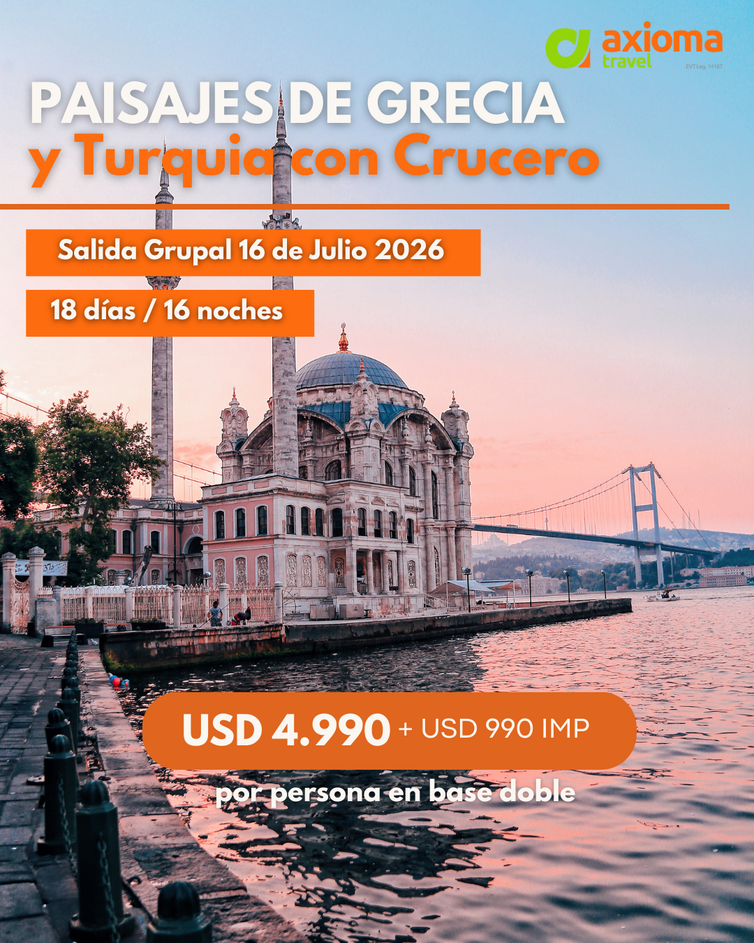 OBSERVACIONES: Tarifas por persona expresadas en USD dólares americanos en base habitación doble válidas para viajar en la fecha indicada y sujetas a modificación. El ítem impuestos incluye impuestos, tasas aeroportuarias, IVA y gastos administrativos. Viajamos protegidos con cobertura ASSISTO 150 con tope de cobertura de USD 150.000.- hasta 74 años. Tickets aéreos en clase económica de Turkish Airlines con equipaje en bodega de 23 Kg máximo 158 cm lineales. Los vuelos, horarios, aeropuertos de salida y/o arribo están sujetos a modificación y/o reprogramación por parte de la compañía aérea sin que sea imputable responsabilidad al operador. Las fotografías contenidas en nuestra web son meramente ilustrativas y no revisten carácter contractual. El hecho de efectuar el pago del derecho de inscripción o seña implica por parte tanto del/de los pasajeros como de la agencia interviniente pleno conocimiento y total conformidad con estas Condiciones Generales y Especiales. Condiciones Generales disponibles en nuestra página web www.axiomatravel.com.ar exceptuando condiciones especiales detalladas para esta salida en el itinerario correspondiente. Operador responsable AXIOMA Travel LEG 14167 EXP 1280/09 – CUIT 20-21459332-8.